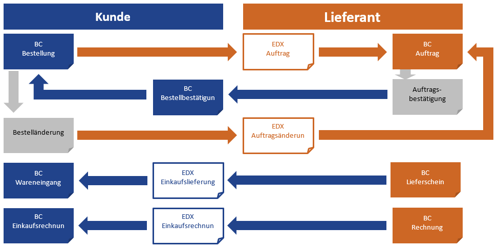 Die folgende Abbildung zeigt den Belegfluss zwischen Kunde und Lieferant in Verbindung mit dem EDX Modul: