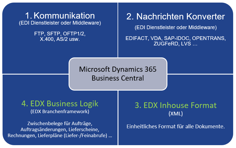 Im Anschluss verarbeitet EDX die konvertierten Nachrichten und importiert diese in Microsoft Dynamics 365 Business Central1. Erforderliche Nachrichten Quittierungen werden innerhalb des internen Belegaustausches automatisch versendet. Bei externem EDI (electronic data interchange) ist eine Abstimmung der Nachrichten-Quittierung mit dem EDI Dienstleister erforderlich.
