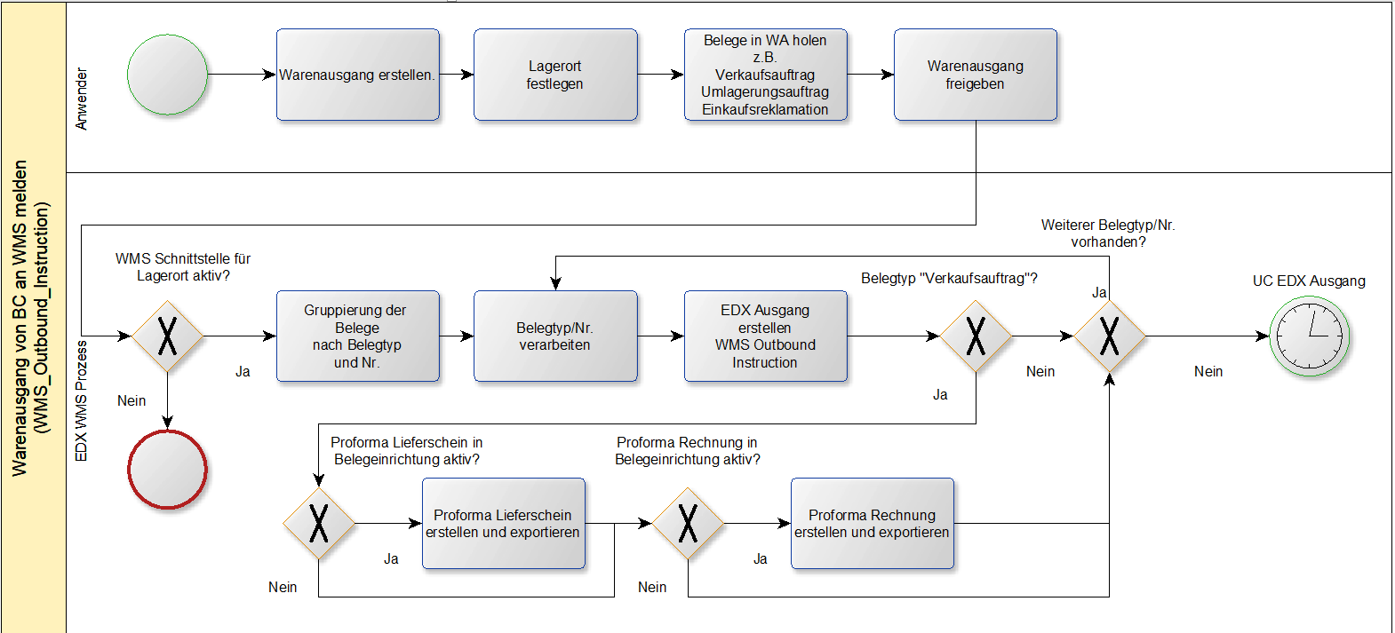 Sollte der Beleg "WMS WHSE SHIPMENT EXP“ nicht für die automatische Verarbeitung konfiguriert sein, dann kann der Warenausgang mit der Aktion "EDX Warenausgang senden“ manuell versendet werden.