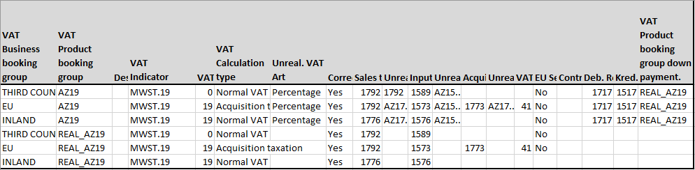The VAT product posting group AZ19 is used for postings with the Unreal. Down payment account (see Accounts Receivable/Vendor Posting Group). The REAL_AZ19 posting group is used for down payment transfer postings.