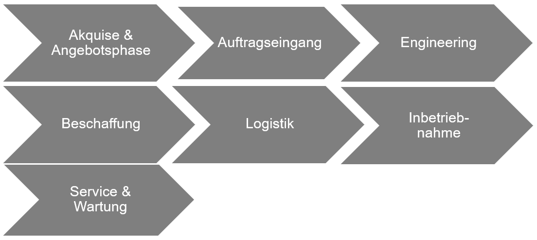 Das nachfolgende Schaubild stellt den Prozess des Anlagenbaus von der Angebotsphase bis hin zu der Service- und Wartungsphase dar: