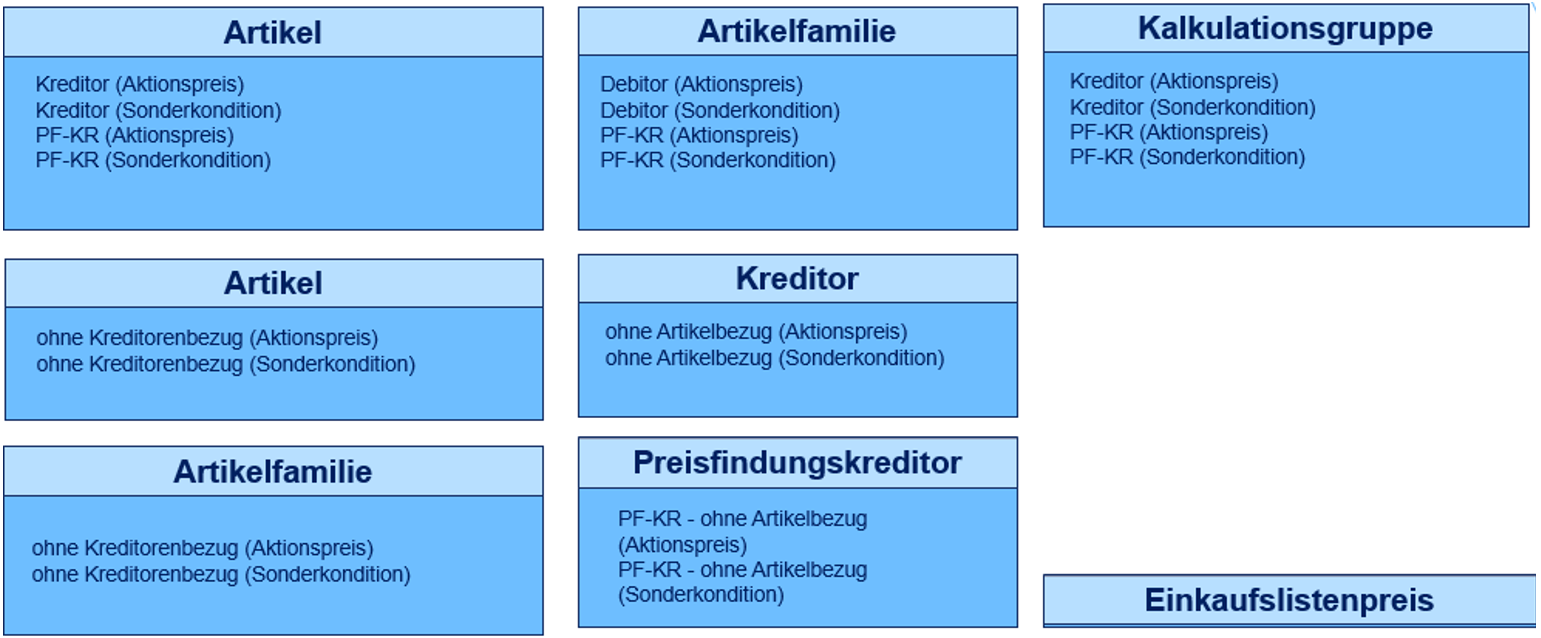 Die Preisarten sind das Resultat aus den unterschiedlichen Kombinationen aus Preisart, Bereich und Konditionsart. Die Hierarchie im Einkaufsbereich unterscheidet sich zu der im Verkaufsbereich aufgrund, dass alle Preisarten auf derselben Hierarchieebene für die Bestpreisermittlung sich befinden. Weiterführende Informationen zum Thema Bestpreis finden Sie im Abschnitt "Preishierarchie".