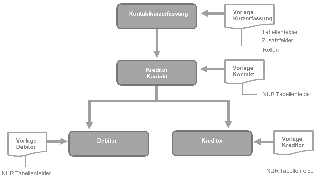 Die Konfigurationsvorlagen werden bei der Erstellung von Stammdaten (Kontakt / Debitor / Kreditor) aus der Kontaktkurzerfassung in einer bestimmten Hierarchie durchlaufen. Diese Hierarchie wird in folgendem Schaubild dargestellt.