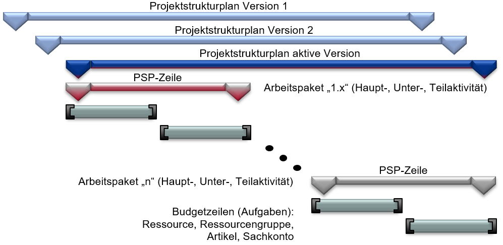 Projekte werden über Projektstrukturpläne (PSP) gegliedert. Pro PSP-Zeile können ein Arbeitspaket und Aktivitätscodes zugewiesen werden. Als Aktivitätscodes stehen Haupt-, Unter- und Teilaktivitäten zur Verfügung. Die Aktivitätencodes dienen zum einen der weiteren Gliederung im PSP als auch zur Identifizierung einer PSP-Zeile innerhalb des Projektes. Eine PSP-Zeile wird durch seine Kombination aus Arbeitspaketcode und den Haupt-, Unter- und Teilaktivitätscodes eindeutig. Das bedeutet, dass innerhalb eines PSP ein Arbeitspaketcode mehrfach vorkommen kann (also mehrere PSP-Zeilen besitzen den gleichen Arbeitspaketcode), jedoch müssen sich diese PSP-Zeilen durch mindestens einen Aktivitätscode unterscheiden. Pro Arbeitspaketzeile können Budgetzeilen für ein detailliertes Budget hinterlegt werden. Diese Budgetzeilen können je nach Detailgrad auch für eine Aufgabenverwaltung herangezogen werden. Wird eine PSP-Zeile ohne Detailbudget (also ohne Budgetzeilen) geplant, so kann die Planung direkt auf der PSP-Zeile erfolgen.