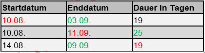 Dabei werden die Daten wie folgt automatisch berechnet (wobei bei der Dauer nur Werktage berücksichtigt werden): rot = von AnwenderIn geändert grün = Berechnet