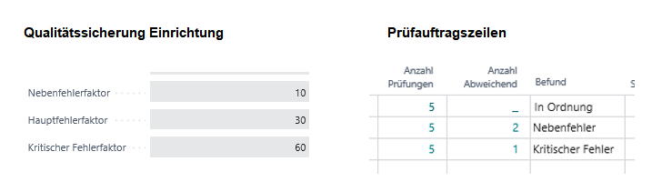 | Prüfpflicht bei Fehler | Ist die Prüfpflicht bei Fehler mit "Ja“ eingerichtet, müssen bei den Prüfergebnissen: Nebenfehler, Hauptfehler oder Kritischer Fehler in den Prüfauftragszeilen, die Prüfergebnisse für die komplette "Menge zu prüfende" erfasst werden. Ist die Prüfpflicht bei Fehler mit "Nein" eingerichtet, ist die komplette Rückmeldung der "Menge zu prüfen" bei den Prüfergebnissen: Nebenfehler, Hauptfehler oder Kritischer Fehler in den Prüfauftragszeilen, nicht notwendig. Ist die Prüfpflicht bei Fehler mit "Nein" eingerichtet, erfolgt die Berechnung der Qualitätszahl im Prüfauftrag auf Basis der "Erforderlichen Prüfmenge" aus dem Kopf des Prüfauftrags. |