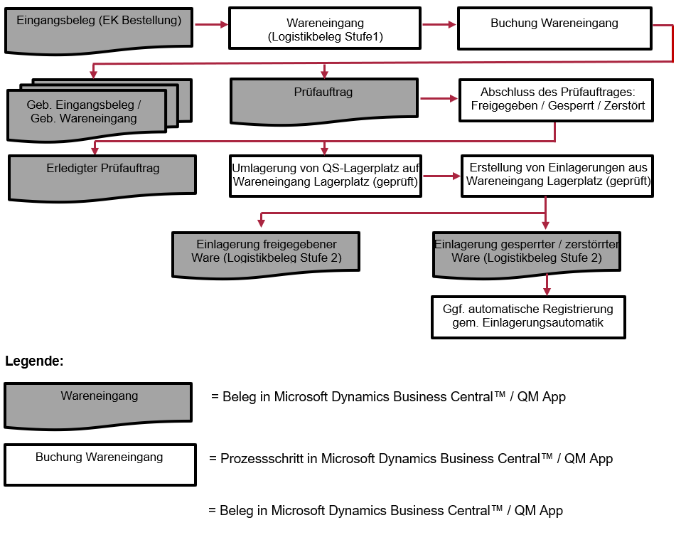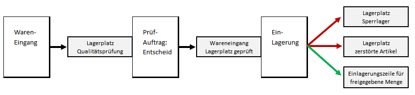 Wenn keine Lagerlogistik oder nur die einstufige Lagerlogistik verwendet wird, sieht der Eingangsprozess für Artikel, die eine QS-Prüfung durchlaufen müssen, wie folgt aus: